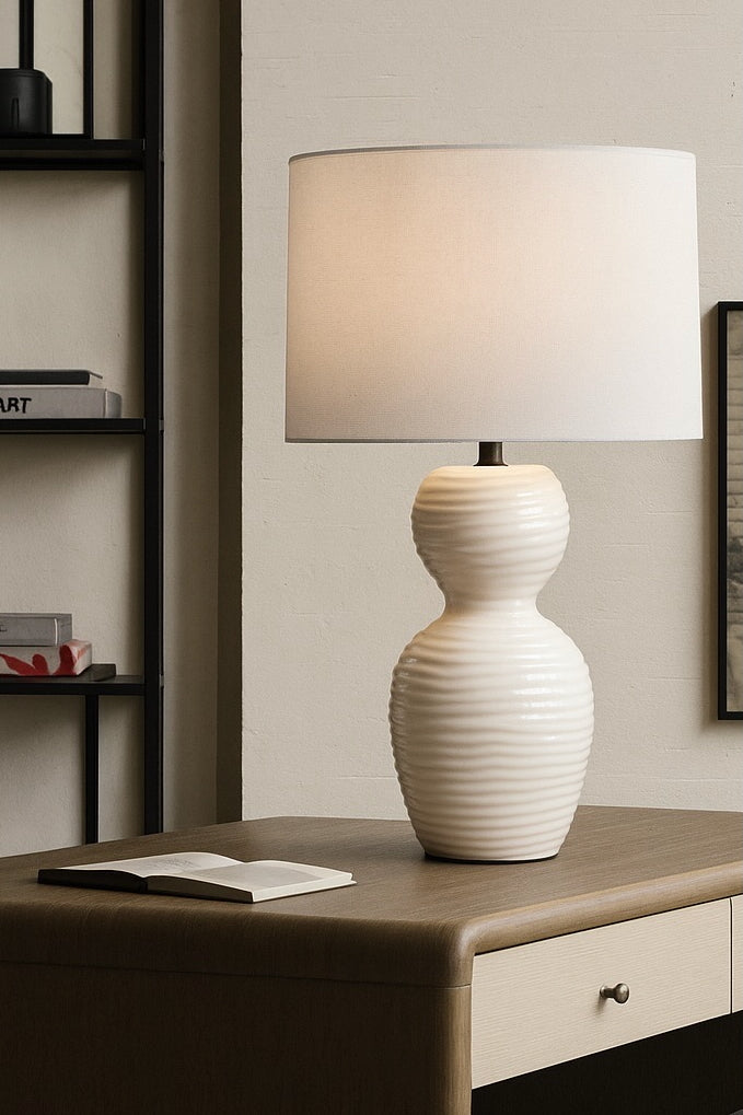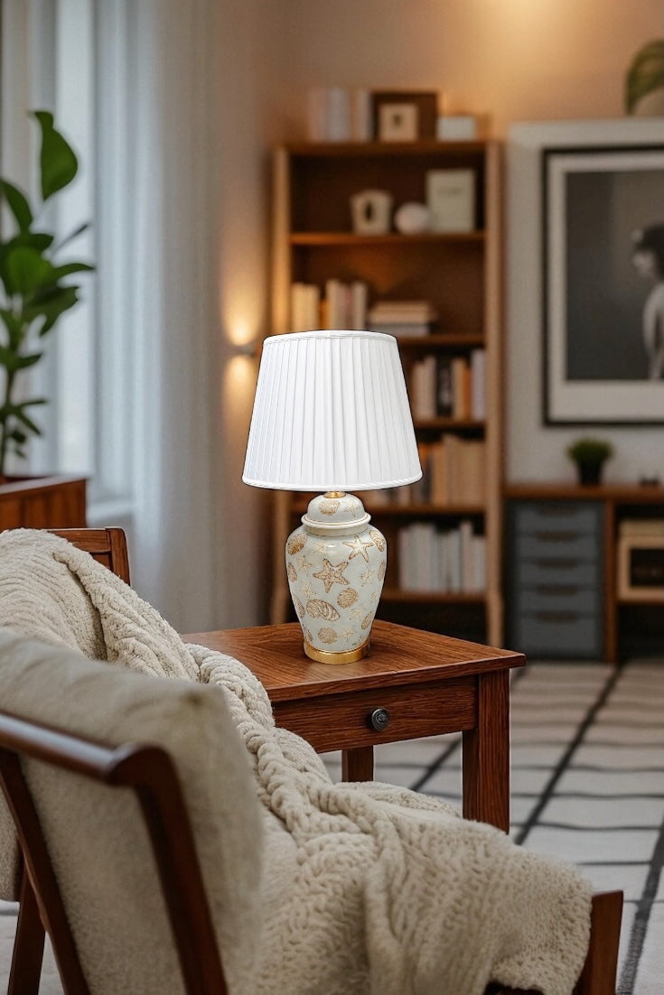 A timeless blue-and-white ceramic lamp with floral motifs, finished with a pleated white fabric shade for a vintage touch.