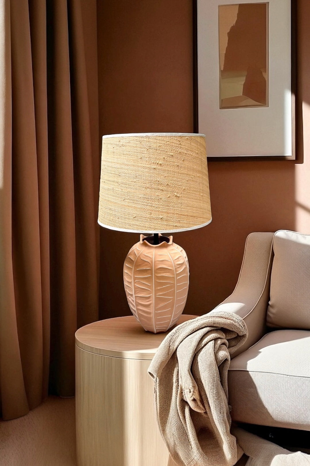 Crafted from matte clay with a dotted texture, this earthy table lamp stands on a bold black circular base for a modern rustic touch.