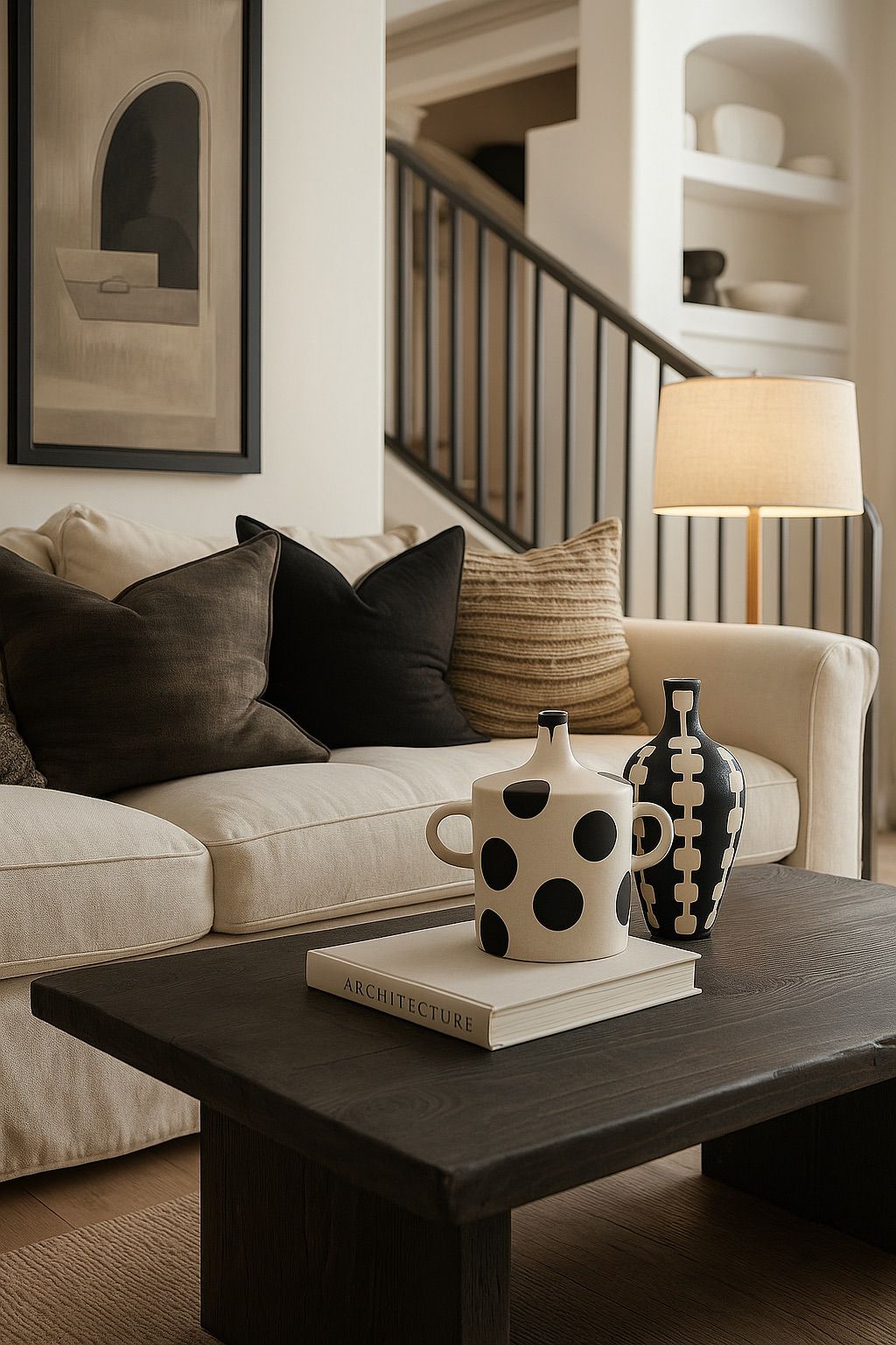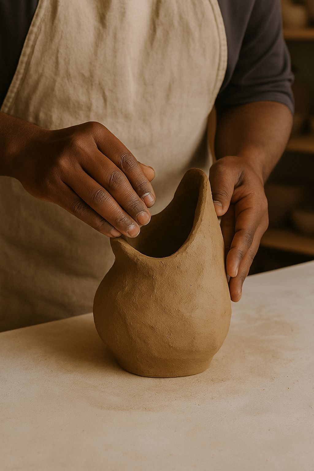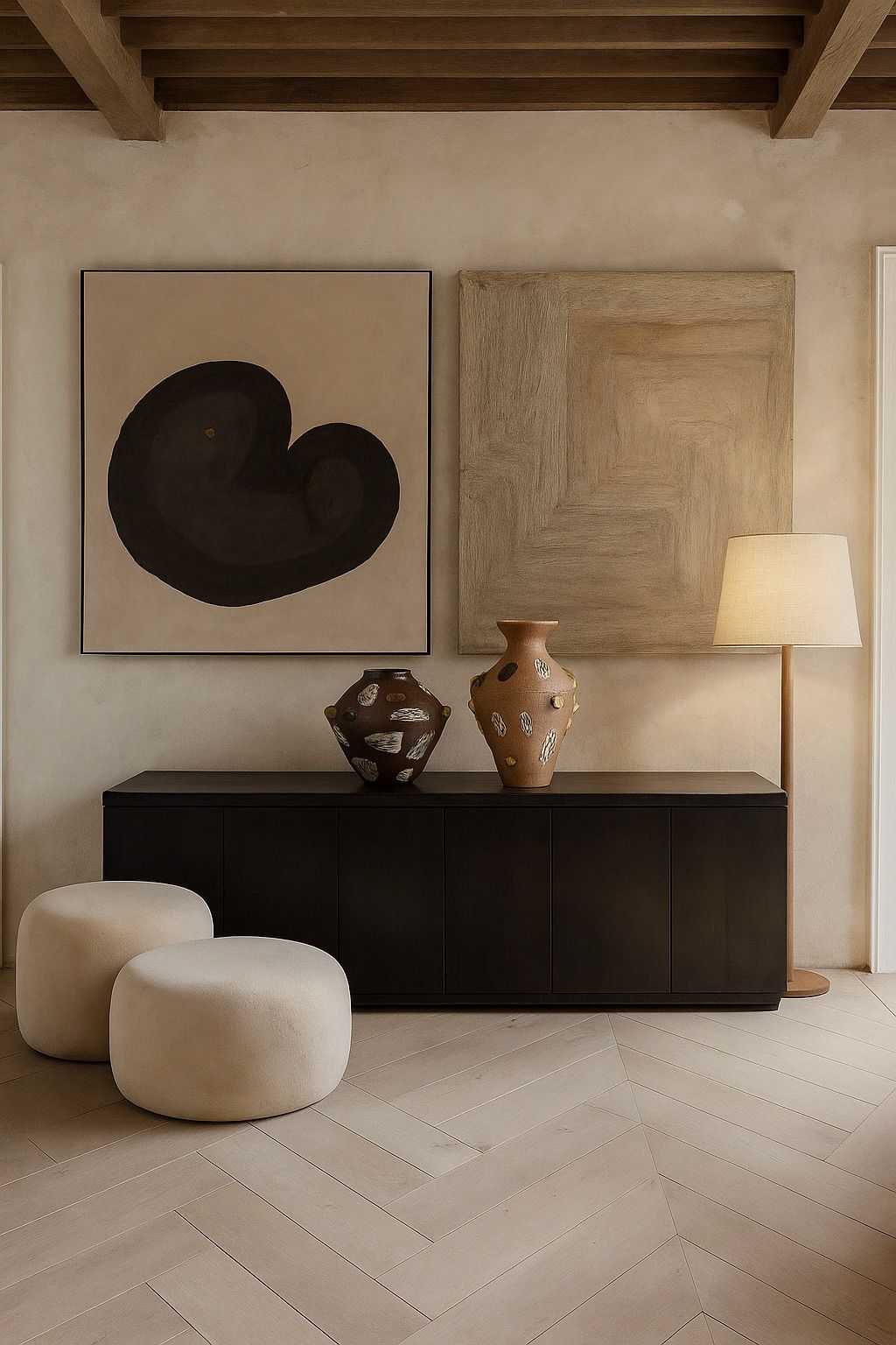 Echoing the quiet elegance of desert landscapes, the Desert Bloom Vase is handcrafted from warm-toned stoneware and finished with tactile textures and organic appliqué motifs. The sculpted gold handles rise like sun-scorched ridges, while ivory and charcoal inlays evoke ancient fossil markings. Its flared neck and slender form lend it a ceremonial presence—equally striking as a standalone sculpture or a vessel for dried blooms.